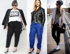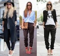 Na maioria das vezes a calça jogging é combinada com salto alto ,mais em produções mais descontraídas pode ser combinada com tênis e t-shirts.